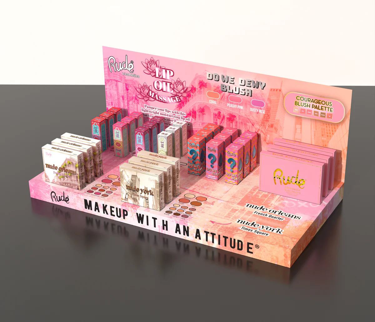 DISPLAY DIMENSIONS: 24''/W x 12''/D x 10''/H Rude Cosmetics City Collection Includes: City Collection Display Set Holds: 30pcs / Back-Up Stock: 3pcs each / Total: 60pcs  NAME COLOR ITEM NUMBER RETAIL PRICE QTY Lip Oil Massage Lip Oil Chillaxin’ Cherry 38141 $6.00 6 Lip Oil Massage Lip Oil Strawberry Sauna 38143 $6.00 6 Lip Oil Massage Lip Oil Pampered Passionfruit 38145 $6.00 6 Lip Oil Massage Lip Oil Green Tea Detox 38146 $6.00 6 Do We Dewy Liquid Blush Coral 38235 $10.00 6 Do We Dewy Liquid Blush Peachy Pink 38236 $10.00 6 Do We Dewy Liquid Blush Dusty Rose 38237 $10.00 6 Face & Eye Palette Nude York 21047 $15.50 6 Face & Eye Palette Nude Orleans 21048 $15.50 6 Blush Palette Courageous 38230 $11.00 6 City Collection Cardboard Display Set - 38596 $0.00 1